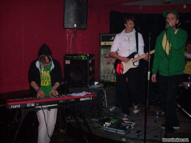 Erste Band heute Abend sind die Rude Tins aus der Schweiz. Acht Musiker, die eher Ska als Skapunk spielen. Eine Schreddergitarre mit heftigster Verzerrung ist zwar dabei, aber insgesamt eher lieblich als dreckig.