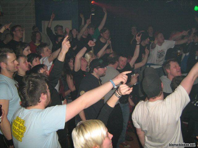 Ah geht doch, die Tanzfläche füllt sich wieder! Ist zwar grad mal ein Jahr her, dass Knochenfabrik hier gespielt haben, aber diesmal sind ja auch deutlich mehr weit Angereiste dabei, schätz ich jetzt mal. Ich mag Bilder mit Zeigefingern.