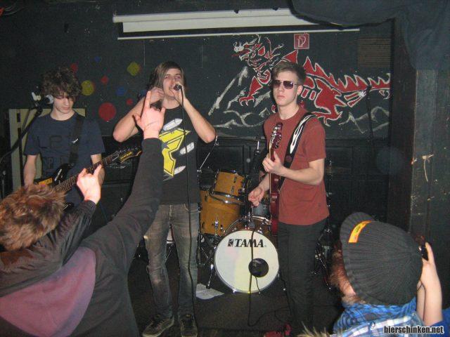Ein paar Bierchen und Schnäpse später steht schon die nächste Band auf der Bühne: Let Op De Drempels. Der Name verspricht ja schon mal viel Spaß, die Frisur des Sängers nicht. Und die Musik halte ich maximal 1-2 Lieder aus. Die Band und ihre Fans haben zwar anscheinend gut Spaß am Auftritt, aber mich reißt das nicht mit.
