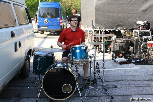 Nach ner halben Stunde wars dann auch schon wieder vorbei mit den Reggae-Klängen und die The Bottrops beginnen so langsam mit den Vorbereitungen. Ah, da hamwa ja einen Musiker von den Bottrops. Ace ist der Nachfolger von Robo Borowski und kann viel besser Gitarre als Schlagzeug spielen, angeblich. Komisch nur, dass man ihn immer nur hinter der Schießbude sieht, so auch bei den rockenden Schuhen.