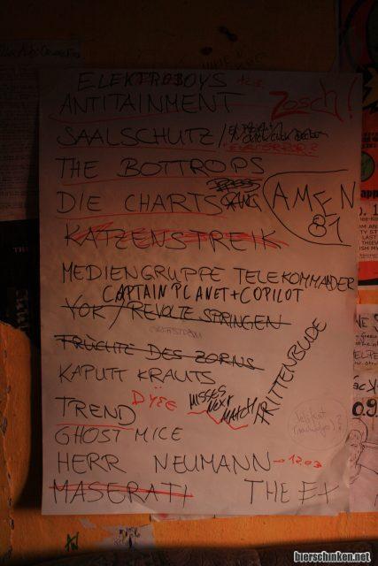 Natürlich ließ auch die schwere Scheiße nicht lange auf sich warten, Soundcheck, Merch aufbauen, aufs Essen warten (lecker!), Zeit rumbringen. Und wie macht man das am Besten? Genau, mit Fußball schauen, nach etlichen Minuten und Probieren der x Fernseher kommt Slashi auf die Idee, ins Büro zu gehen und den Livestream zu schauen. Fuchs! Im Büro gibts auch sone tolle Konzertplanungsliste...