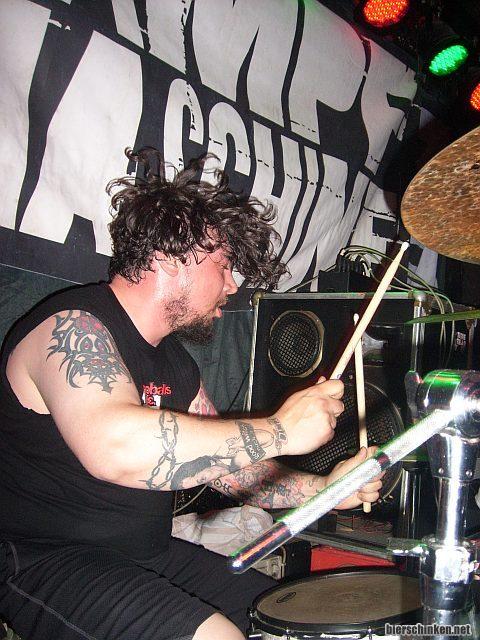 Immer schwer den Drummer zu erwischen. Hier eine gelungene Abbildung. Das aus dem Publikum geforderte Drum-Solo gibt Sir Schnalli trotzdem nicht. Ist aber auch nicht nötig, den er kloppt auch so geil rein.