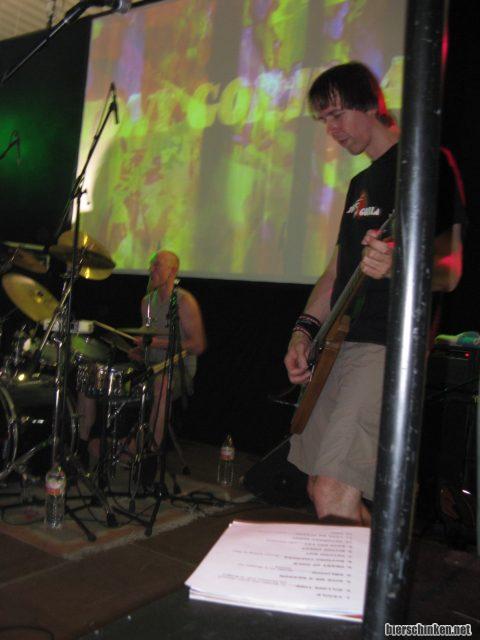 Kleines Novum: Die Band wartet mit einem animierten Banner auf. Beamer sei Dank. Is irgendwie auch angenehmer als wenn im Hintergrund ein Fußball-Spiel läuft, so wie beim gestrigen Porters-Gig