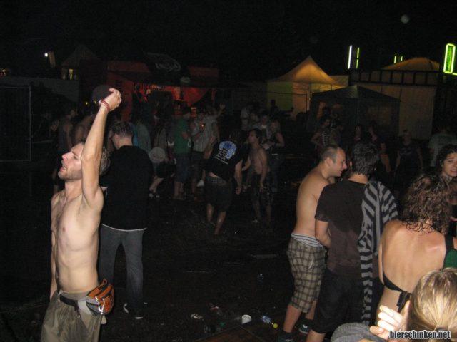 So, Zeit für das große Highlight des heutigen Tages: Das Unwetter! Dunkle Wolken kündigten es an, wenig später sorgte der Wind für die Gewissheit, dass sich hier etwas ganz Großes zusammenbraut. Als es schließlich so weit ist, die ersten Pavillons wegfliegen und der Weg nur noch aus Pfützen besteht, steht der Party nichts mehr im Wege!