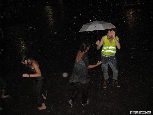 Ja, und dann kommt es endlich: DAS UNWETTER! Die Bar gegenüber der World Stage ist sowieso schon legendär, was die wilden Partys dort betrifft, aber bei diesem Wetter stürmen nochmal deutlich mehr Leute rein, der DJ sorgt für exzellente Musikauswahl, bis keiner mehr still steht