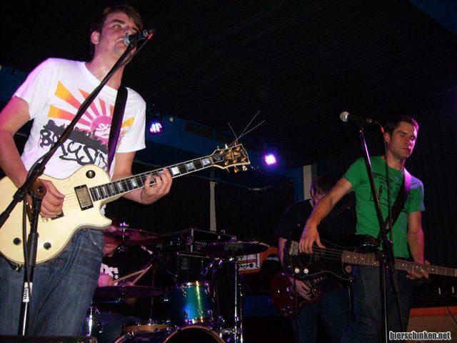 Als erstes spielen The Universal Indicator aus Trier. Beim ersten Song denke ich noch an Jimmy Eat World. Bei den folgenden Liedern wird es dann schon Riseagainstiger. Und die Jungs rocken auch ordentlich und schwingen das Tanzbein. Drei der vier Musiker teilen sich den Gesang und schreien auch alle ordentlich. Besonders der singende Trommler hat eine angenehm raue Schreistimme.