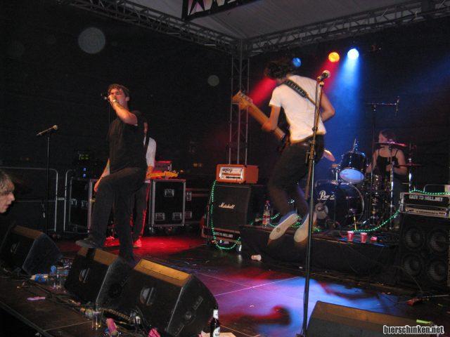 Oh, ein Sprungfoto! Die anwesenden Zuschauer sind auch recht angetan, es gibt mehr als amtlichen Applaus, alle zufrieden. Kann man sich ruhig öfter mal geben, die Band. Weiter so.