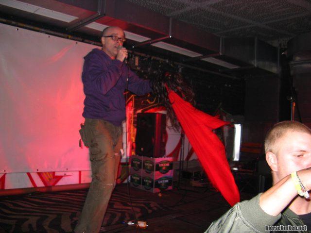 Bühne. Karl Nagel und sein Idiotenklavier. Chaostage-Initiator und ehemaliger Kanzlerkandidat. Und ein großes Ego, groß genug um sich hier alleine auf der Bühne zu präsentieren und den kleinen Punkern seine Autobiographie visuell darzubieten. Unter dem Gesichtspunkt des Trash ganz nett, aber mehr als ein paar Minuten halte ich das nicht aus.