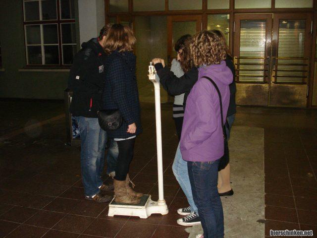 Allerdings finden wir noch eine Waage, die wir mitschleppen, und uns dauernd wiegen. Die ham wir dann bei der Res in den Hitnerhof gestellt, so dass sich der Gärtner auch wiegen kann.