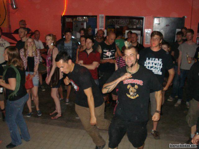 Publikum ist auch schon einigermaßen präsent. Wenn auch die Ansage des Sängers "doch etwas weiter nach vorne zu kommen" nicht fruchtet. Zurecht, denn sowas fordert man nicht. Einige lustige Gestalten tanzen trotzdem.