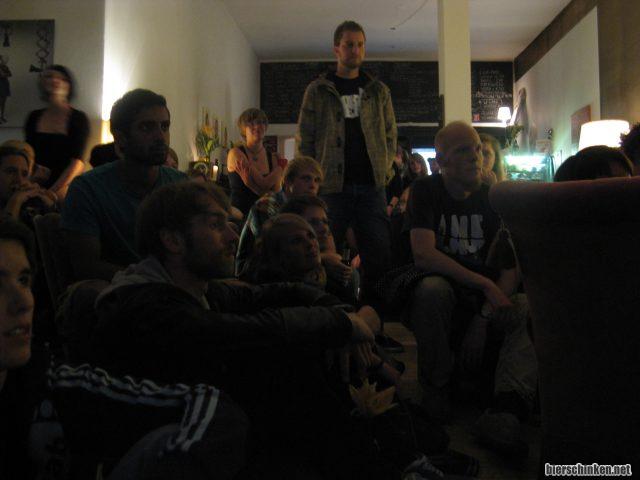 Achja, hier sieht man mich sitzen (danke Katja fürs Foto). Seht ihr, wie ich leide? Und heimlich Stefan beneide, der ganz mutig da steht? Verdammt. Immerhin sitze ich auf einem Bierkasten, aber das macht es nicht besser. Scheiße ey. Kann ich mich jetzt bitte wieder auf den Auftritt konzentrieren?