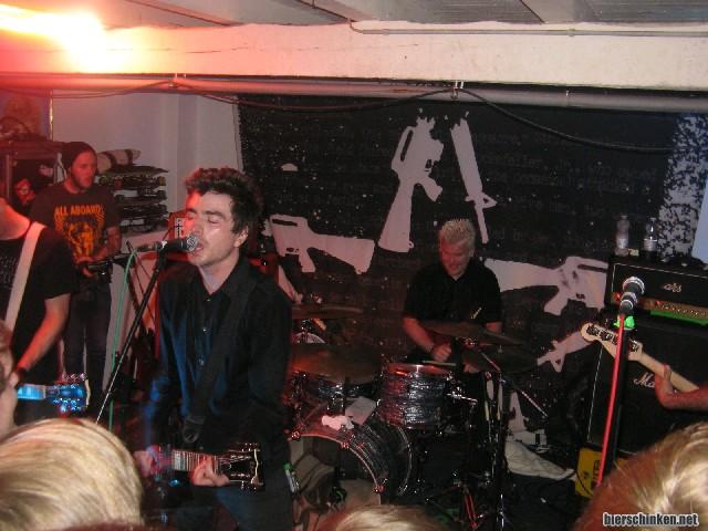 Kurz Raucherpause. Oder genauer gesagt Luft schnappen. Is aber unmöglich, sowohl hier drinnen als auch im Vorraum als auch draußen ist es einfach unerträglich heiß und schwül. Und drinnen wirds nach und nach schlimmer, der Raum füllt sich nämlich immer mehr (kein Wunder), aber so unter uns: ich hab den Club Scheiße schonmal voller gesehen. Nur direkt vor der Bühne, da ist irgendwann kein Durchkommen mehr, als ANTI-FLAG ihren Auftritt starten.