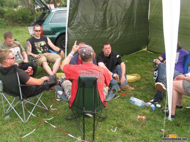 Anschließend? Es spielen nun The Movement - letzte Woche erst gesehen. Dann die Dödelhaie - eigentlich ne gute Band, aber keine, die man zu oft sehen sollte: irgendwann hat man die Ansagen einfach über. Also lieber zurück zum Parkplatz (Zeltplatz ist uns zum Rumasseln zu assig), Bierchen trinken (in meinem Fall natürlich alkfreies) und über die Welt schwadronieren. Immer mal unterbrochen durch ein herzhaftes "Ihr Penner" aus Bargs Kehle. Hach. Normale Leute.
