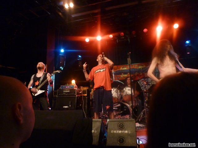 Beispiele für die grottenschlechten Texte hab' ich leider keine, nach 2 Minuten habe ich da erfolgreich auf Durchzug gestellt. Aber mal was aus der Bühnenshow: Zu Beginn werfen sie Slipeinlagen ins Publikum. Wäre es dabei geblieben, könnte es ja noch irgendwie lustig gewesen sein. (Naja, wahrscheinlich nicht, aber nehmen wir's mal an)