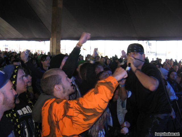 Macht aber allein vom Zugucken her schon Spaß! Der Sänger erweist sich als ein wahrer Wirbelwind, verbringt große Teile des Konzerts an der Absperrung oder inmitten der Fans, die begeistert mitsingen. Auch wenn's nur "Who-ho-ho" ist, denn diese Rock'n'Roll-Floskel verwenden Death By Stereo wirklich inflationär.