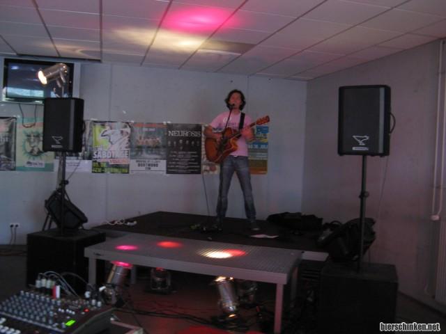 Kurz mal gucken, was im Foyer geboten wird - da läuft man ja sowieso ständig vorbei. Und Akustikgitarren-Songwriter passen da meiner Meinung nach besser hin als Räpper. Naja. Gerade auf der Bühne: COSIMO ERARIO. Mischung aus Jazzgitarrist, Straßenmusiker und Songwriter, aber mit italienischen Songs. Respekt. Kann auch was, nur komme ich da gerade mal absolut gar nicht drauf klar. Schade aber auch.