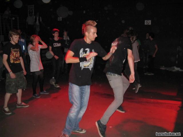 Was sind eigentlich 90% von Null? Ich hab ja offen gestanden nicht nachgezählt, aber als die Band anfing, tat sie dies tatsächlich vor einem absoluten Minimum an Publikum. Füllt sich aber nach und nach, sogar mit Nicht-Bottropern. Die entern auch direkt die Tanzfläche, starten nen fleißigen und ausgiebigen Pogo-Reigen, der nur zwischendurch unterbrochen wird, um zu fragen, wie die Band da auf der Bühne eigentlich heißt.