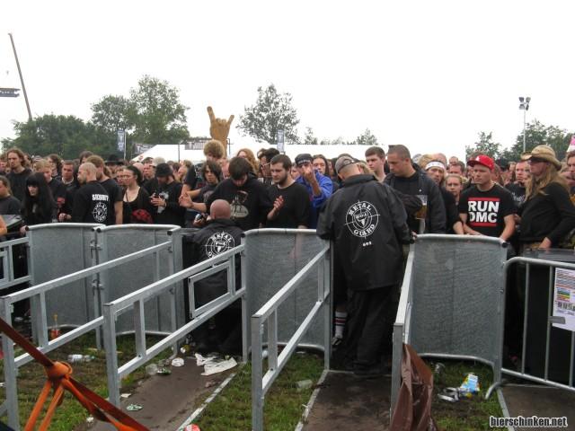 Ich schleppe Mike mit zum Wrestling-Zelt. Das ist eines dieser überflüssigen "Neuerungen", die dafür sorgen, dass die vielen Idioten auf dem Festival beschäftigt werden können. Wrestling, Oil-Catchen, Wet-T-Shirt-Contests...braucht das tatsächlich jemand? Naja. Immerhin, zur "Rechtfertigung", bekommt auch diese Attraktion ne eigene Bühne. Und Einlasskontrollen, die uns in ihrer Gründlichkeit die Zornesröte ins Gesicht steigen lassen.
