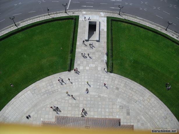 Ausblick steil runter. Hier war ja mal die Love Parade: Wahrscheinlich wurde die ganz schlau da unten durch dieses Mini-Tunnelchen gescheucht.