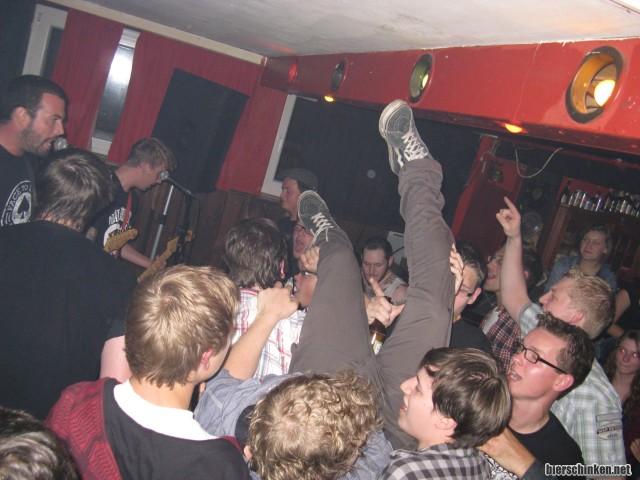 Ich verkriech mich erstmal wieder am Merchstand. Praktisch in der Teestube: Der ist nur ein paar Meter neben der Bühne, so dass ich immer mal ein paar Schritte machen kann, um meine Pflichtfotos vor der Bühne zu schießen. Aber bei NOTHINGTON - ach scheiß drauf, ich hab den Stand ja auch von hier im Blick!