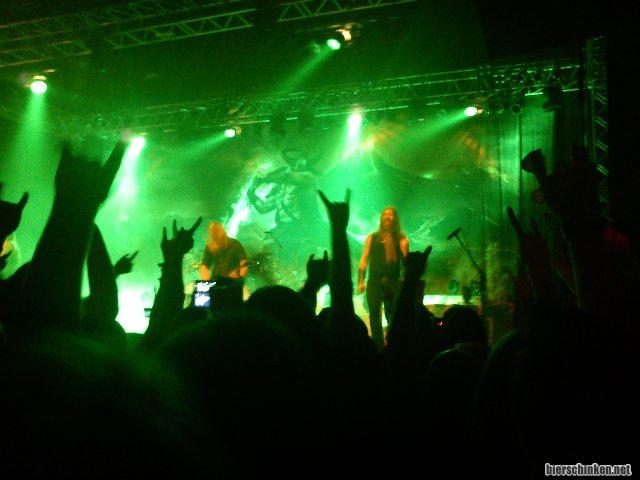 Über allem ragte die fantastische Grölstimme von Sänger und Gute-Laune-Mensch Johan Hegg heraus. Beim einsetzenden Gesang wurden alle meine Innereien kurzum 3 Meter weiter nach hinten in der natürlich ausverkauften Turbinenhalle verfrachtet..