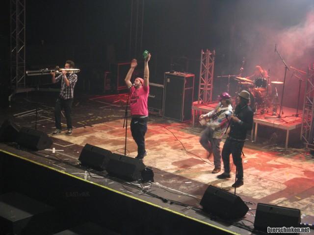 Keule sind gerade mit der Sondaschule auf Tour, was vermutlich erklärt, warum sie hier ins Programm gerutscht sind. Chris und Tim geben noch kurz die special guests bei "Die Fluppe danach", gemeinsam feiert man sich ein wenig ab, das Publikum macht auch bereitwillig mit, und ich trinke aus lauter Verzweiflung ein Bier. Hilft aber nicht.