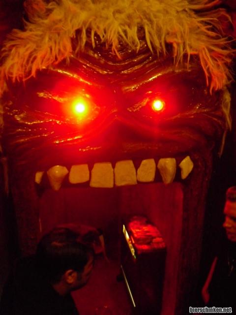 Nach der Darbietung der Blackmailers wollen wir nach draußen um frische Luft zu schnappen, doch wer raus will kommt wohl erstmal nicht mehr rein und so halten wir uns im Treppenaufgang direkt neben dem TikiMonster auf.