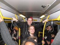 Noch ein wenig Schunkeln zu DJ Lars, irgendwann Heimweg. Im Duisburger Hbf dann die Durchsage, dass derzeit keine Züge ein- und ausfahren. Scheiße. Also Massenpanik im Nachtbus nach Mülheim. Schoko rettet uns übrigens alle, indem er unter Einsatz seines Lebens eine leere Bierflasche nach draußen befördert. Nahezu ein Ding der Unmöglichkeit, wenn der stämmige Securityproll, der ebendies einfordert, ihm dabei im Weg steht. Wieso müssen Leute, die in solch verantwortungsvollen Aufgabenbereichen arbeiten, eigentlich immer autoritätssüchtige Vollhonk-Egomanen sein? Naja, wenn man unbedingt herausfordern will, dass man die Witzfigur für die gesamte Busladung darstellt - meinetwegen.