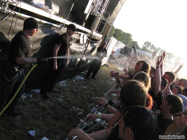 Achja: Heiß ist es immer noch. Dem Hitzetod vorgesorgt wird durch gelegentliche Wasserschlauch-Attacken in den vorderen Reihen. Hilft auch, Staub zu vermeiden. Find ich gut und kommt gerade sehr erfrischend. Der Security hat auch sichtlich Spaß daran, die Punks ordentlich zu säubern.
