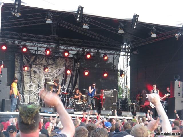 Anschließend: MARKY RAMONES BLITZKRIEG. Naja, darüber sind die Meinungen geteilt. Einzige Ansage vom "fast letzten lebenden Ramone" Marky selbst, als er ankündigt, ein paar Ramones-Cover zu spielen - danach stolziert er zum Schlagzeug und es hagelt ne Dreiviertelstunde Ramones-Hits. Ohne Pausen, recht originalgetreu. Trotzdem gibts genug Ramones-Coverbands, die das genauso gut hingekriegt hätten.