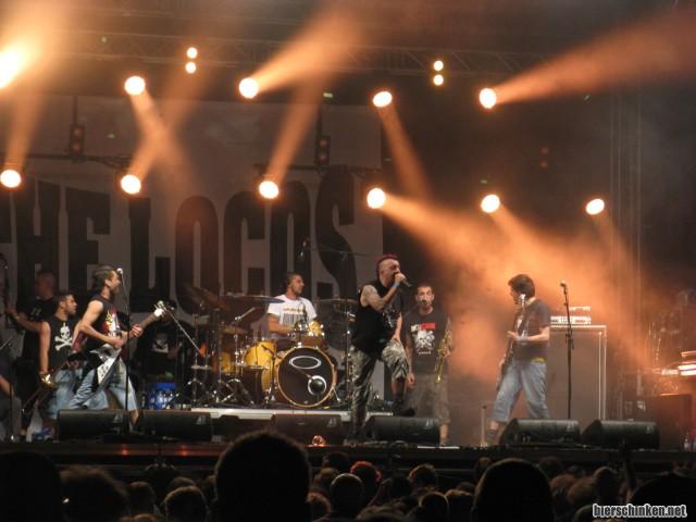 Auf der großen Bühne, letzte Band des Festivals: THE LOCOS! Zweitband vom Ska-P-Zweitsänger Pipi. Fand ich mal gut, mittlerweile aber einfach nicht mehr. Gute-Laune-Skapunk mit pseudopolitischem Anspruch. Ein paar Coversongs, ein paar neue Stücke, nichts Besonderes. Nicht gesehen habe ich irgendwelche Verkleidungen. Verpasst, oder verzichtet Pipi mittlerweile darauf?