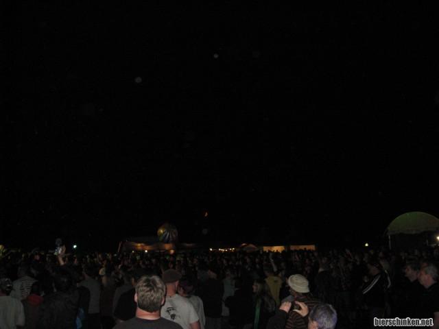 Lieber das Konzert vom Rande aus verfolgen, ohne Sicht zur Bühne und dafür auf den Mond, der heute dick, orange und sichelförmig ist. Und hier nur ansatzweise zu sehen. Egal. Maks stellt erstaunt fest, viel zu viele Biermarken zu besitzen und bettelt die umstehenden Leute an, doch noch eins zu trinken. Nagut.