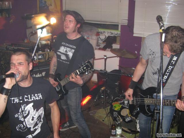Zunächst mal muss dem Unten LinX heute noch wat attestiert werden: Super Sound! Ist hier damit ja nicht immer zum Besten bestellt, aber heute klingt das, gemessen an den Umständen, echt ordentlich. Hut ab! Auch noch nicht lange: Es gibt sowas wie ne Bühne, oder sagen wir ein Podest! Da passt Sänger Olli zwar nicht mehr drauf, aber immerhin die anderen. Stark.