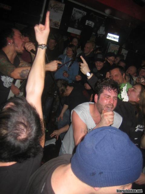 Moshpit. Vorne in der blauen Mütze einer von Robinson Krause. Viel Prominenz am Start, das geübte Auge findet auch noch Hannes von den Affen irgendwo auf dem Bild.