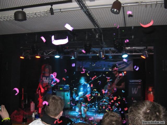 Konfetti-Kanonen, da lässt man sich nicht lumpen. Musik auch durchaus okay, zumindest wissen die Herren, was sie da tun. Trotz lustiger Verkleidung. Zum Ende hin, als die fünfte Konfetti-Kanone rausgeholt wird und auch zum zweiten Mal die Pyroshow-Leuchtfackeln die Luft verpesten, wird mir das dann doch zu eintönig. Mit viel Alkohol bestimmt super zu ertragen: Immer einen heben, wenn der Sänger "Hey, Blue Notez" sagt.