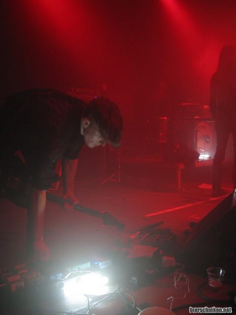 Ganz schön krass. Ich hatte ja im Vorfeld Sorgen, dass die Atmosphäre, die schon beim konservierten Hörvergnügen spürbar ist, im weiten Club des FZW etwas verloren geht, aber erstens sind hier mehr Menschen als erwartet, zweitens sieht man eh nichts, und drittens kriechen die Bässe bis in den kleinsten Zwischenraum. Und überhaupt - keine Frage, was die Gitarristen da an Effekten zaubern ist auch erwähnenswert, aber was Bass und Schlagzeug uns hier für ne feste Wand entgegen schleudern, da muss man echt schlucken. Wenn man denn könnte, der Kehlkopf ist irgendwie schon längst gegen die Wirbelsäule gedrückt. Urgs.