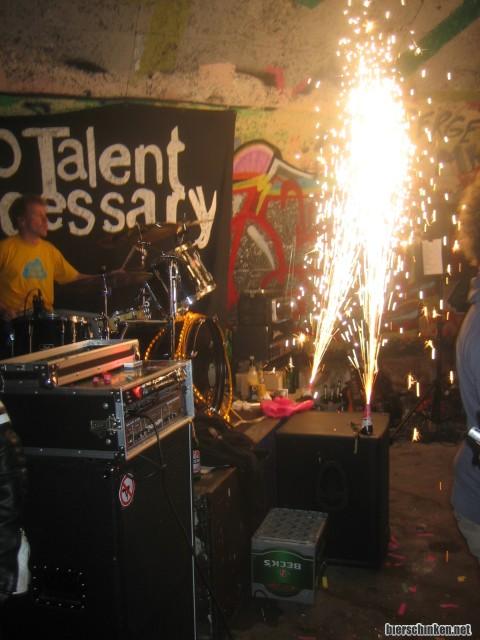 Pyroshow! Die Scorpions wären stolz. Passend zu den Scorpions wird eine andere Mauerfall-Hymne gecovert: Looking for Freedom von The Hoff. Nach ca. 20 Anrufen schaffen die Versackten es, uns zu finden. Die Beschreibung "ganz vorne bei der Band, die spielt" war wohl zu unpräzise.
