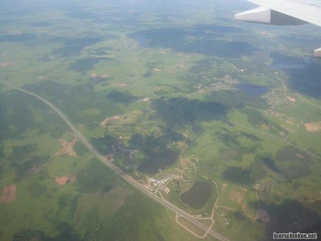 Start am Dienstag morgen! Wir sind zunächst zu viert, die letzten beiden stoßen erst am Donnerstag zu uns. Achja: Aus Gründen der Anonymität (und damit wir uns die Namen unserer Mitreisenden nicht merken müssen), erkennt ihr uns in diesem Bericht ausschließlich anhand unserer Protokoll-Nummern. Also: Wir sind 1, 3, 4 und 5. Hier übrigens Litauen aus der Luft. Man sieht viel grün, ab und zu auch blau, dafür wenig Berg.