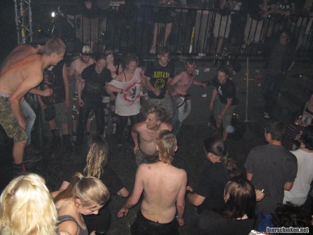 Ein paar Offbeat-Parts in den Songs, hier und da mal Tempowechsel, Mitgröl-Refrains und so weiter. Also, falsch machen die definitiv nichts, aber andere können das besser. Mich fesselt eh mehr das Publikum. Wahrlich eine Wonne, zuzuschauen, wie nach und nach immer mehr Oberkörper unbekleidet über die Fliesen schliddern. Und eine Wall of Death darf natürlich auch nicht fehlen! Ich schwanke zwischen mir ständig die flache Hand vor die Stirn kloppen und totaler Abfeierei, erreiche aber beide Extreme nicht so ganz und bin, sagen wir mal, angenehm belustigt.