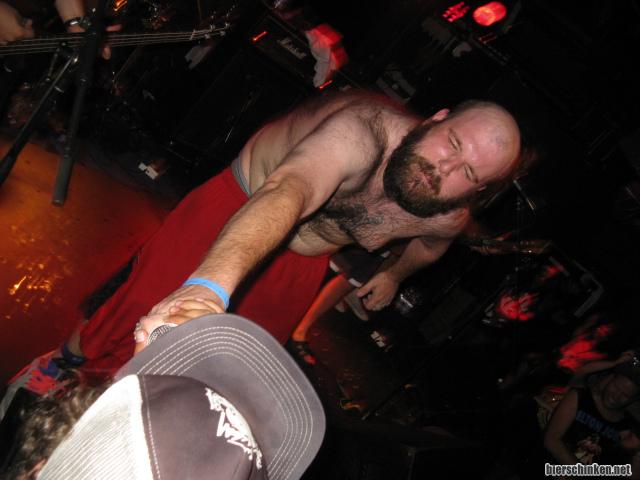 Bringen wir mal noch ein paar Foto-Eindrücke. Hier wird einem Kappenträger das Mikrofon in die Fresse gedrückt. Sehr textsicheres und ausgelassenes Publikum heute!