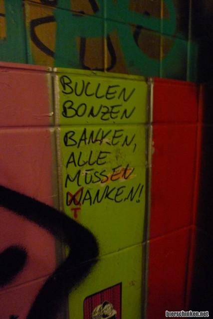 Bandpause, Saufen, auch mal wieder ins Klo. Die Wände der Toiletten sind mit Parolen vollgeschmiert, von denen jede zweite durch Ändern einiger weniger Buchstaben humoristisch abgeändert wurde. "Ulrike Meinhof - das war Sport". "Keiner raucht Chefs". Gibt immer was zu Schmunzeln beim Gang in die Keramikabteilung.