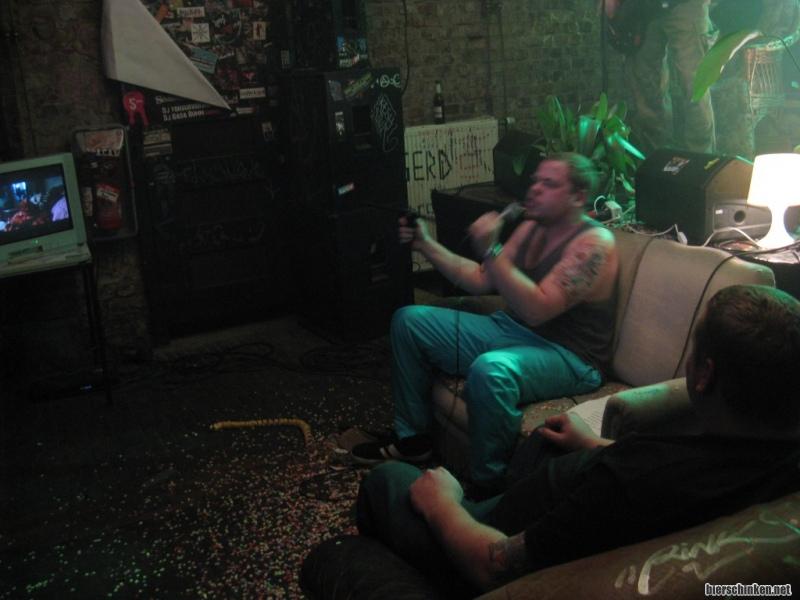 Fö: Ankunft 16:03 - und die erste Band spielt tatsächlich bereits! Ist das hier wirklich das AZ? Sieht zwar so aus, aber irgendwie will ich das nicht ganz glauben. Ich hätte ja mit Beginn um 23 Uhr gerechnet, egal, wie viele Bands spielen. Aber die heutigen Organisatoren scheinen den regelmäßigen Blick auf die Uhr ernst zu meinen. Es spielen: Die SUNFLOWERS OF DEATH! Bühnenshow besteht aus Topfpflanzen (was ein Wort), Wohnzimmerlampen, zwei Sofas, etwas Konfetti - und einem TV-Gerät, auf dem Helge Schneiders Texas läuft! Mit Ton! Geil!