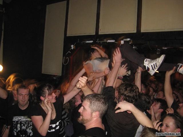 Was auch nicht ganz funktionierte: Die Do-It-Yourself-Garderobe in Form eines Heizkörpers im vorderen Bereich der Kneipe, auf der sich bereits vor dem Konzert die Kleidungsstücke stapelten und nach dem Konzert eine Schlange von Leuten versuchte, ihre jeweilige Jacke oder ihren Pulli oder was auch immer zu zu ordnen. Wie man hört, wurden auch einige Sachen vertauscht. Wie betrunken muss man eigentlich sein, um aus Versehen ne fremde Jacke mitzunehmen? Das ist ja schon fast auf dem Level Zigarette-am-Filter-anzünden. Höhö.