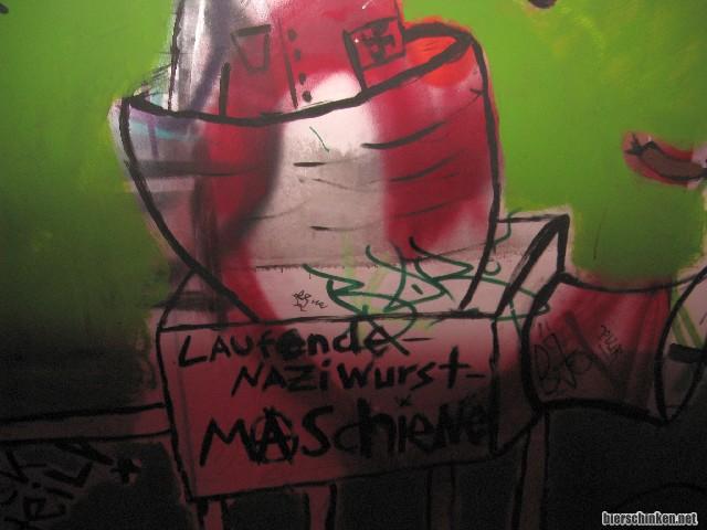 SJZ Siegburg, bunter und vor Wandbemalungen und -beklebungen strotzender Laden im Innenhof einer ehemaligen Schule. Ist hier erst seit anderthalb Jahren situiert, vorher war es knapp 20 Jahre an anderer Stelle. Was wohl heißt, dass sich die Anwohner erst an die betrunkene pöbelnde Meute gewöhnen müssen, die jetzt regelmäßig vor ihrer Tür rumasselt. Beziehungsweise muss ihnen erstmal gesagt werden, dass besagte Meute eigentlich der örtliche Karnevalsverein ist mit den komischen Bunthaarigen vom SJZ nix zu tun hat.