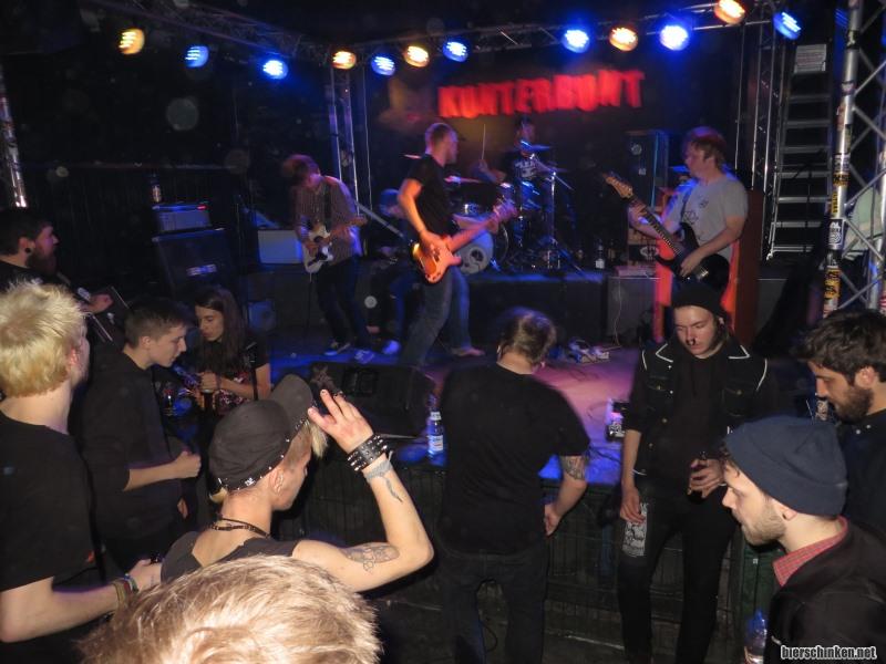 Als ich wach werde, spielt bereits die nächste Band. Verdammt! "Willy Foicht und die vierzig Rabauken", die sind super, ich glaub ich kenne die von irgendnem Schlachtrufe-Sampler, waren auch kürzlich mit Berliner Weisse und Gumbles auf Ostdeutschlandtour, wenn ich mich richtig erinner. Ich finde ne Pulle Korn hinterm Sofa, schmeiße stattdessen mein Shirt dahin und laufe zur Bühne.