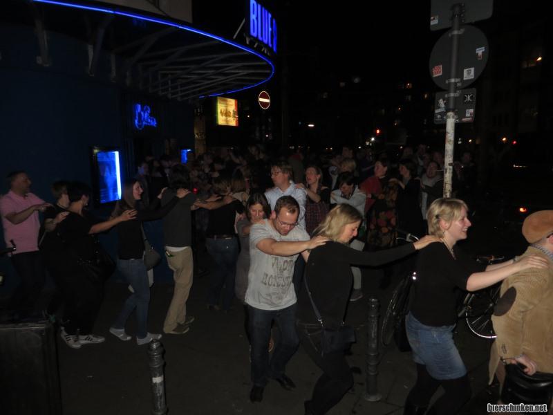 Und nicht nur vom Karneval, auch vom Blue Shell. Gefühlt 200 Mann stark ist die Schulterkolonne, die nun über die Straße zieht. Perfektes Timing übrigens für die Brasilianer von STATUES ON FIRE, die morgen ihre Tour starten (12.4. in Schwerte! hin!), heute in Köln gelandet sind und soeben am Kiosk gegenüber ihr verdientes (x-tes) Willkommens-Bierchen zischen, als die Polonaise vorbei zieht. Perfektes Timing von Tourmanager und Touristenführer Caddy, und so finden sich unverhofft ein paar Samba-affine Oberkörper mehr in der nicht enden wollenden Polonaise.