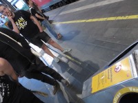 Derweil gibt's drinnen die große Tombola-Auslosung. Am Eingang konnte man Lose kaufen, und nun gibt es verschiedenste Gewinne zu erstehen. Skateboard-Decks, Socken, Platten, Shirts und so weiter. Markus gewinnt irgendwas, ist aber nicht da als seine Nummer gezogen wird, also kriegt es wer anders. Die arme Sau. Vielleicht hätte er ja auch die Chance auf ein neues Paar Skatersocken gehabt. Nunja. Die Tombola-Ziehung zieht sich etwas (hohoho), aber immerhin packt der Tonmensch noch ein paar irre witzige Effekte aufs Mikro, und dann müssen alle lachen. Der helle Wahnsinn.