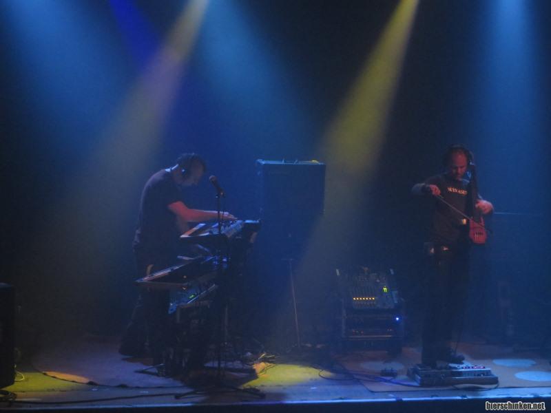 Anschließend kurze Umbaupause und weiter mit DUBVASION. Hervor gegangen aus Subvasion, einem Kooperationsprojekt von Guts Pie Earshot und der Elektrokünstlerin LNA, als Dubvasion aber wieder aufs Duo geschrumpft, wobei der Schlagzeuger diesmal an Keyboard mit Drumpad wechselt und der Cellist auf die leichtere E-Variante seines Instrumentes.