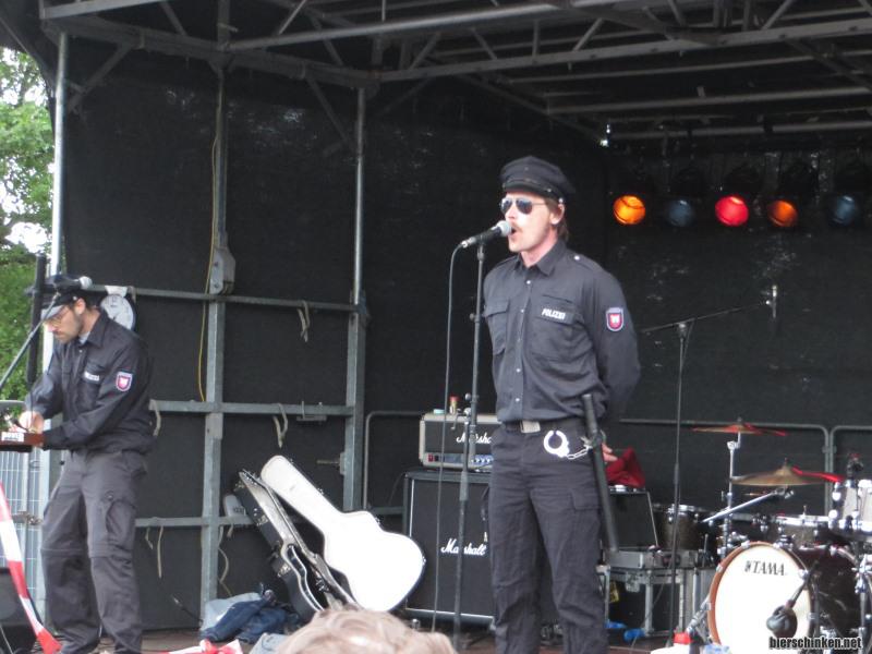 Fö: Es spielen DIE BULLEN! Endlich sehe ich sie mal live! Großartig! Ich bin Fan, noch mehr als zuvor. In feinsten Uniformen präsentiert das neueste Urzeitgekrebse aus der Kieler Inzestsuppe Deutschpunk mit Hardcore- und Elektrosprenklern sowie Texten aus der Sicht der Staatsgewalt. Das hat uns ja gerade noch gefehlt!