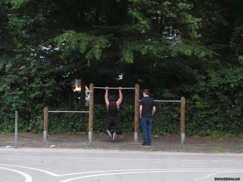 Warm machen vorm Gig. Hier versucht Burn, die Holzpfähle weiter in den Erdboden zu ziehen.